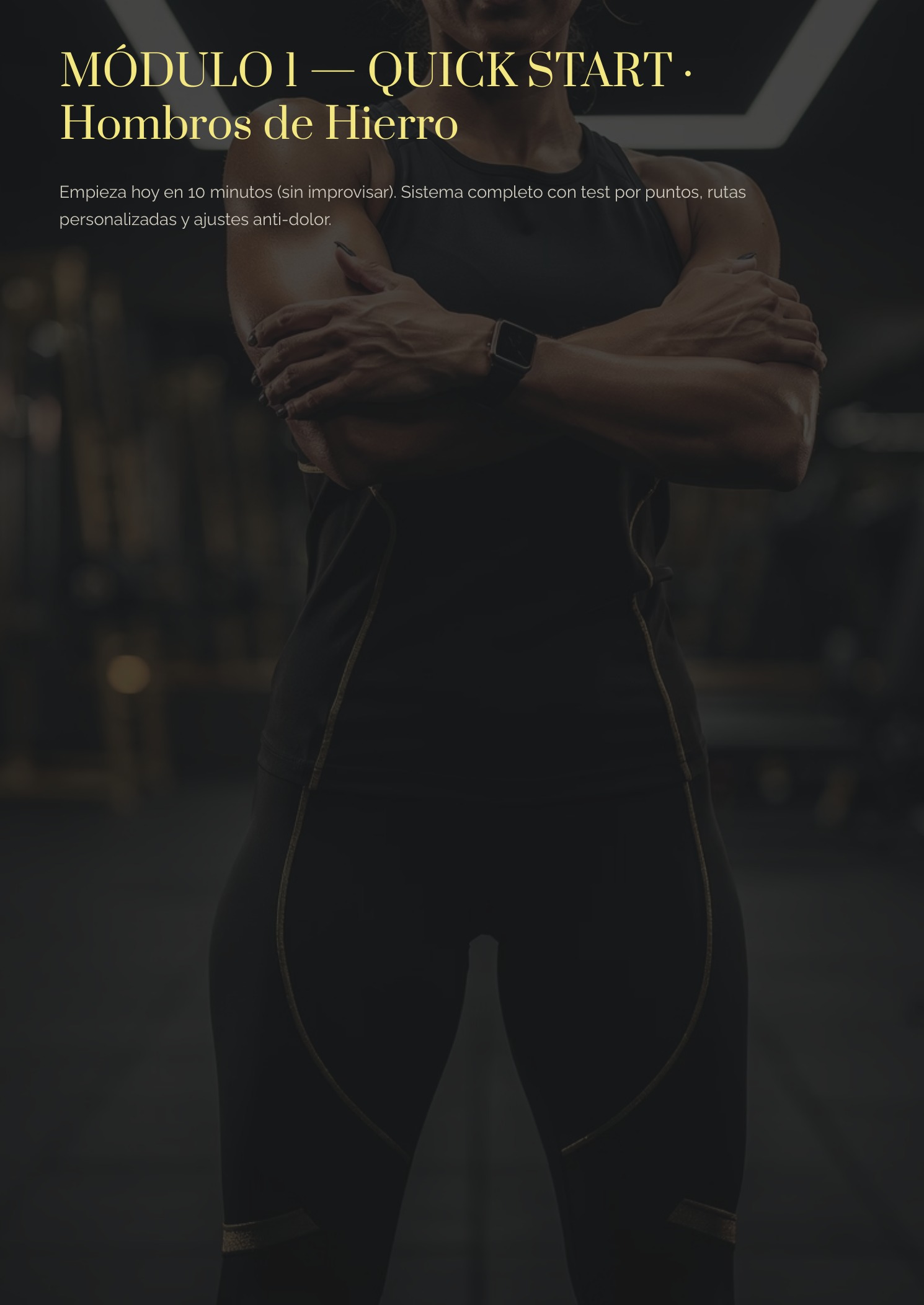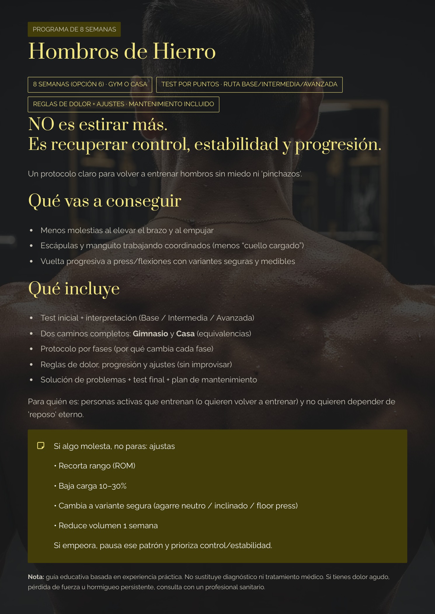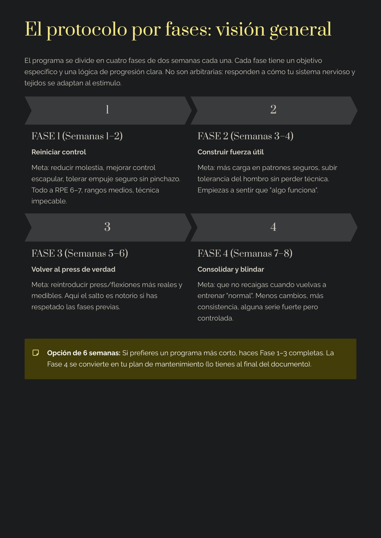 Un protocolo de 8 semanas diseñado para personas activas que quieren entrenar con cabeza: mejorar la función del hombro, recuperar estabilidad y volver a progresar en empujes (press/flexiones) con una progresión clara.