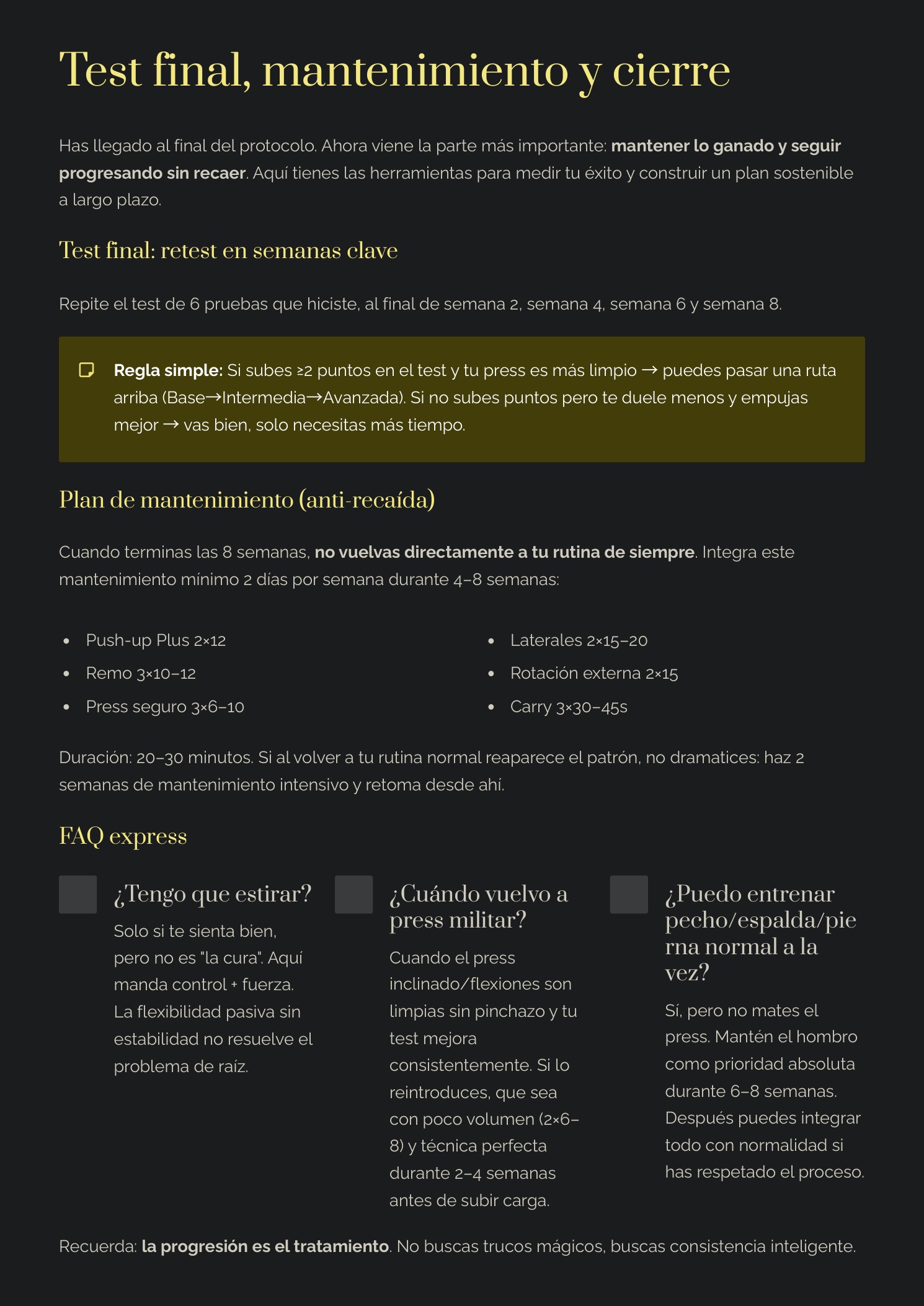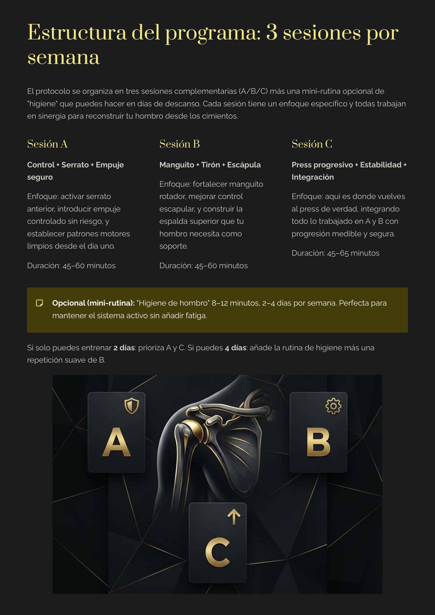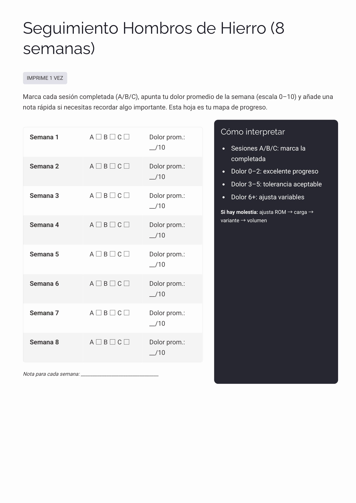Un protocolo de 8 semanas diseñado para personas activas que quieren entrenar con cabeza: mejorar la función del hombro, recuperar estabilidad y volver a progresar en empujes (press/flexiones) con una progresión clara.