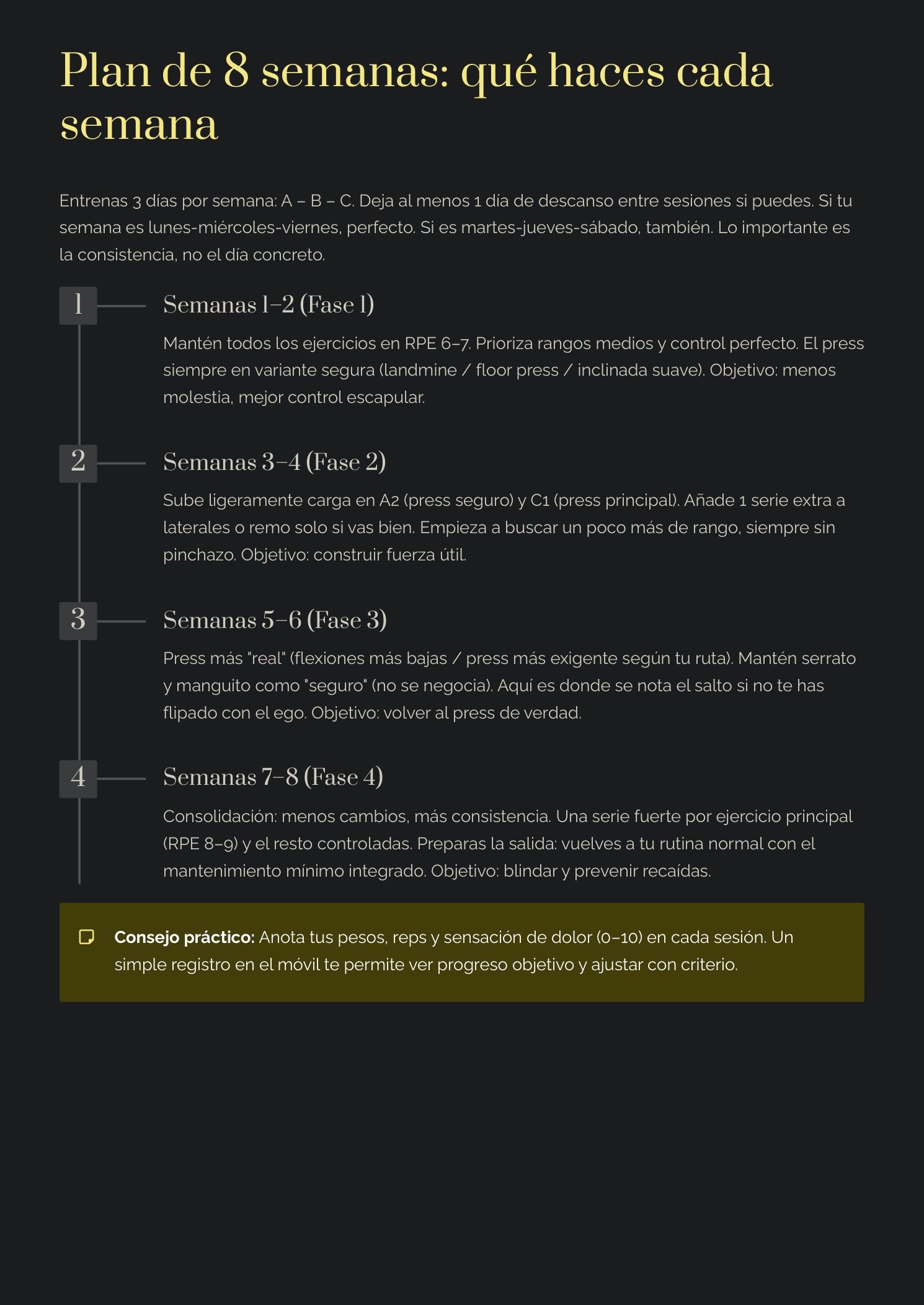 ✅ Programa principal (8 semanas): fases, sesiones A/B/C, progresión, ajustes y cierre.