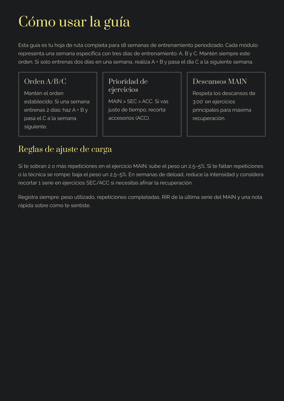 Esto no es “una rutina suelta”: es un plan completo de 18 semanas, 3 días/semana, diseñado para progresar de forma ordenada en fuerza + hipertrofia sin volverte loco cambiando de método cada mes.